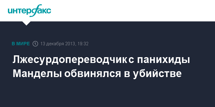 Вашингтон. 13 декабря. INTERFAX.RU - Власти ЮАР проверяют информацию о том, что мужчина, переводивший на язык жестов речи мировых лидеров на церемонии прощания с экс-президентом ЮАР Нельсоном Манделой, ранее привлекался к уголовной ответственности по обвинению в убийстве, передает Associated Press.