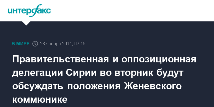 Москва. 28 января. INTERFAX.RU - Участвующие в переговорах "Женева-2" делегаты от властей и оппозиции Сирии во вторник будут обсуждать положения Женевского коммюнике.