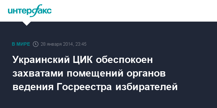 Киев. 28 января. INTERFAX.RU - В Центральной избирательной комиссии обеспокоены многочисленными случаями захватов помещений органов ведения Госреестра избирателей и уничтожения их оборудования в различных регионах.