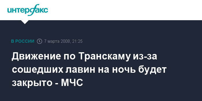 По его информации, сошедшие лавины перекрыли дорожное полотно, в связи с чем движение по Транскаму в предстоящую ночь осуществляться не будет. "Проезд по дороге закрыт, мощность сошедших на магистраль снежных масс составляет, по предварительным данным, от нескольких сотен до 2-3 тыс. кубов", - уточнил собеседник агентства.