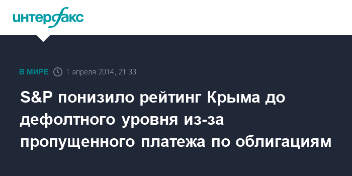 Москва. 1 апреля. INTERFAX.RU - Международное рейтинговое агентство Standard & Poor's (S&P) понизило долгосрочный кредитный рейтинг эмитента Крыма с "CCC" до дефолтного уровня "D" в связи с пропущенным 21 марта купонным платежом на сумму 4,8 млн грн по облигациям, выпущенным на 133 млн гривен.