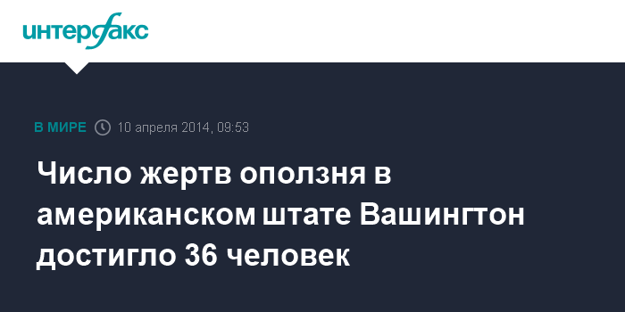 Москва. 10 апреля. INTERFAX.RU - До 36 выросло число жертв оползня, сошедшего в конце марта в американском штате Вашингтон, сообщает американский телеканал CNN.