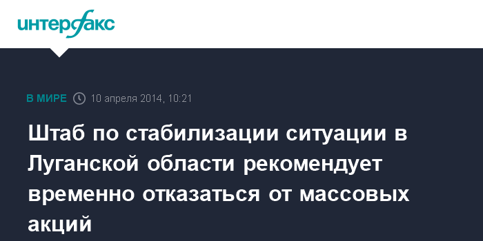 Москва. 10 апреля. INTERFAX.RU - Созданный новыми украинскими властями штаб по стабилизации общественно-политической обстановки и обеспечению общественного порядка в Луганской области рекомендовал политическим и общественным организациям региона временно отказаться от массовых акций, которые могут спровоцировать новый всплеск радикальных настроений.