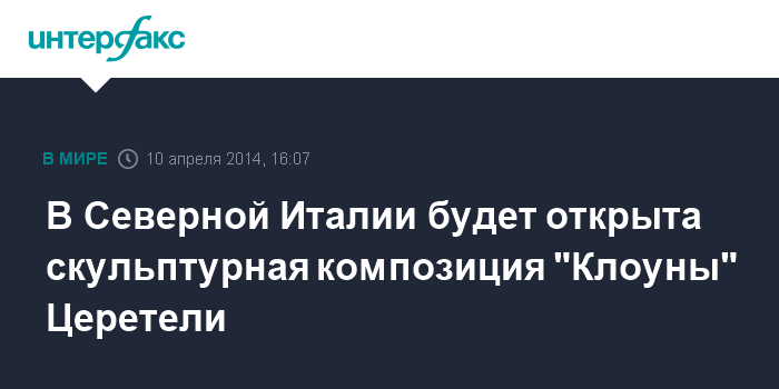 Москва. 10 апреля. INTERFAX.RU - В субботу на площади итальянского города Марчиано ди Романья (область Эмилия-Романья на севере Италии), недалеко от города Римини, состоится торжественная церемония открытия культурной композиции "Клоуны".