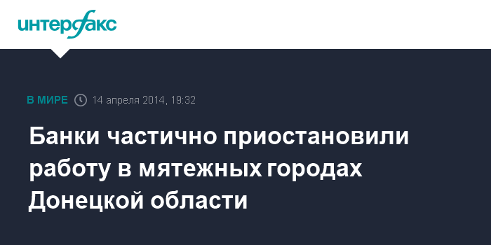 Киев. 14 апреля. INTERFAX.RU - Банки приостанавливают работу ряда отделений в Донецкой области, сообщили агентству "Интерфакс" в кредитно-финансовых учреждениях.