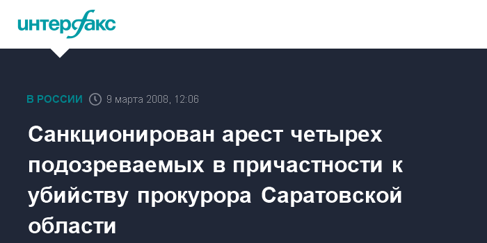 Москва. 9 марта. ИНТЕРФАКС - Суд в Саратове санкционировал арест четырех подозреваемых в причастности к убийству прокурора Саратовской области Евгения Григорьева, сообщил "Интерфаксу" в воскресенье официальный представитель Следственного комитета при прокуратуре (СКП) РФ Владимир Маркин.