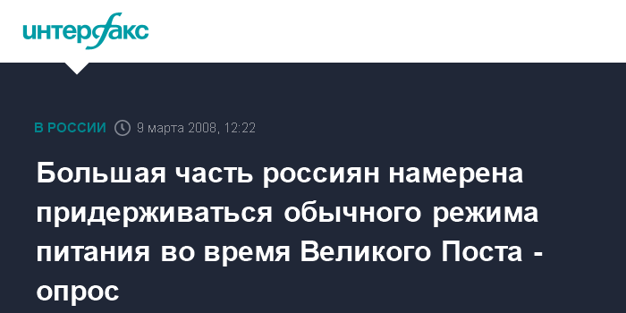 Москва. 9 марта. ИНТЕРФАКС - Сохранять обычный режим питания в течение Великого поста планируют 79% россиян, а 15% - собираюсь поститься частично, например, отказаться от мяса или от спиртного.
