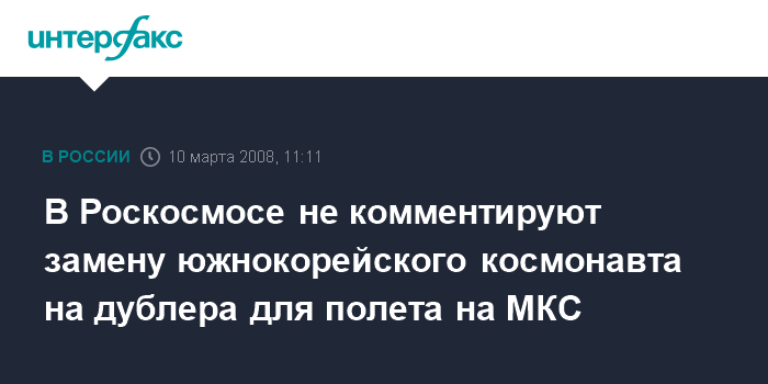 Москва. 10 марта. ИНТЕРФАКС-АВН - Роскосмос не комментирует сообщения в прессе о возможной замене южнокорейского космонавта Ко Сана на его дублершу Ли Со Ен в экипаже российского космического корабля "Союз ТМА-12", который должен отправиться к Международной космической станции в апреле.