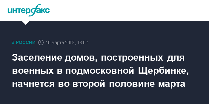 Щербинка. 10 марта. ИНТЕРФАКС-ЦЕНТР - Во второй половине марта будет начато заселение домов, построенных для военнослужащих в подмосковной Щербинке, сообщил журналистам в понедельник первый заместитель руководителя департамента градостроительной политики города Москвы Александр Косован.