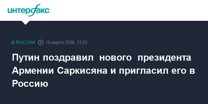 Путин поздравил нового президента Армении Саркисяна и пригласил его в Россию