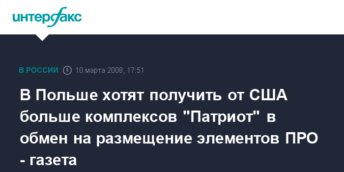 Варшава. 10 марта. ИНТЕРФАКС-ЦЕНТРАЛЬНАЯ ЕВРОПА - Вашингтон готов предложить зенитные ракетные комплексы "Патриот" в обмен на согласие Польши разместить элементы ПРО на своей территории, но Варшава считает число ракет недостаточным, пишет в понедельник газета "Выборча" (Gazeta Wyborcza) со ссылкой на неофициальные источники.