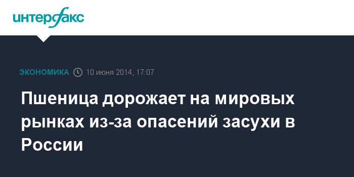 Москва. 10 июня. INTERFAX.RU - Цены на пшеницу на мировых рынках растут во вторник в связи с опасениями сокращения производства зерновых в России из-за засухи, сообщает агентство Bloomberg.