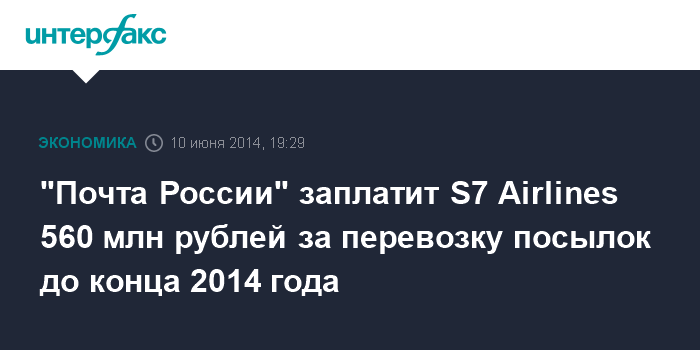 Москва. 10 июня. INTERFAX.RU - ФГУП "Почта России" заплатит S7 Airlines 560 млн рублей (включая НДС) за услуги перевозки почты с марта до конца 2014 года, говорится в материалах предприятия.
