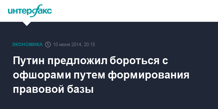 Москва. 10 июня. INTERFAX.RU - Борьба с офшоризацией российской экономики должна вестись не только фискальными методами, но и путем формирования надлежащей правовой базы для ведения бизнеса, заявил президент РФ Владимир Путин в ходе форума "Интернет-предпринимательство в России" в Москве.