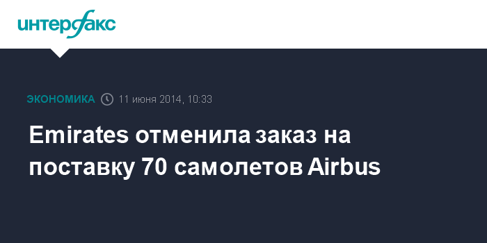 Москва. 11 июня. INTERFAX.RU - Авиакомпания Emirates Airline отменила заказ на поставку Airbus 70 широкофюзеляжных самолетов A350, говорится в сообщении Airbus Group NV. Речь идет о заказе на 50 самолетов A350-900 и 20 самолетов A350-1000, сумма которого по цене каталога составляла $21,6 млрд.