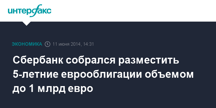 Москва. 11 июня. INTERFAX.RU - Сбербанк может разместить 5-летние еврооблигации объемом до 1 млрд евро - источники