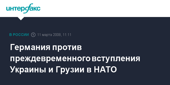 Киев. 11 марта. INTERFAX.RU - Канцлер Германии Ангела Меркель высказывается против преждевременного присоединения Украины и Грузии в НАТО. Об этом она заявила в понедельник в Берлине, сообщает украинская служба радиостанции "Немецкая волна".