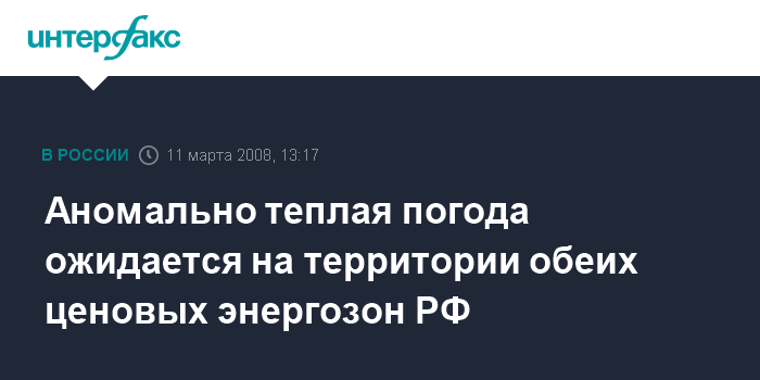 Москва. 11 марта. INTERFAX.RU - Гидрометцентр прогнозирует в течение недели аномально теплую погоду на территории обеих ценовых энергозон в РФ, сообщила "Интерфаксу" представитель ведомства Людмила Паршина.