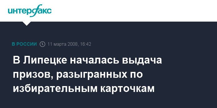 Липецк. 11 марта. INTERFAX.RU - Выдача призов, разыгранных по карточкам избирателей, которые распространялись в ходе голосования на состоявшихся 2 марта президентских выборах, началась во вторник в здании администрации Липецка.