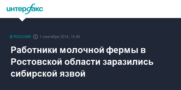 Москва. 1 сентября. INTERFAX.RU - Двое работников молочной фермы в Ростовской области госпитализированы в больницу с диагнозом "сибирская язва", сообщили агентству "Интерфакс" в пресс-центре областной станции по борьбе с болезнями животных.