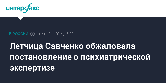 Москва. 1 сентября. INTERFAX.RU - Защита украинской летчицы Надежды Савченко, обвиняемой в РФ в соучастии в убийстве российских журналистов, обжаловала назначение ей психиатрической экспертизы, сообщил в своем фейсбуке адвокат Савченко Николай Полозов.