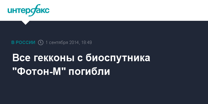 Москва. 1 сентября. INTERFAX.RU - Все пять гекконов, находившихся на борту научного космического аппарата "Фотон-М" №4, погибли, сообщил "Интерфаксу" источник, принимавший участие в обеспечении посадки аппарата. Причины смерти ящериц устанавливаются.