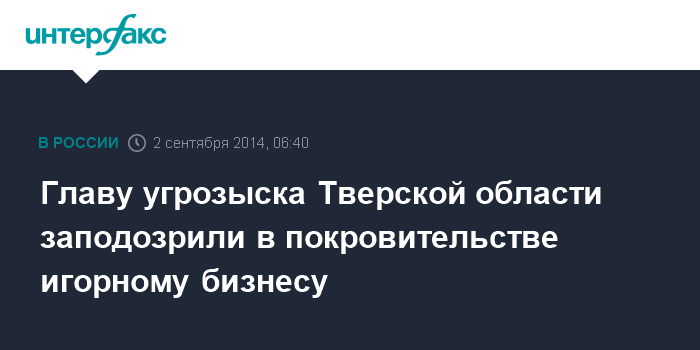 Москва. 2 сентября. INTERFAX.RU - Начальник управления уголовного розыска УМВД России по Тверской области подозревается в покровительстве незаконной игорной деятельности. Об этом сообщается на сайте УМВД.