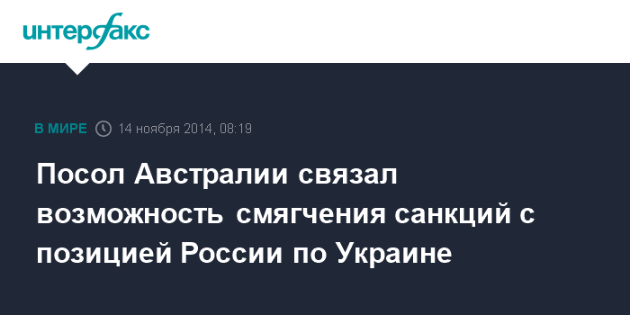 Москва. 14 ноября. INTERFAX.RU - Австралийский посол в Москве Пол Майлер обусловил возможность ослабления введенных его страной санкций в отношении России изменением российской политики в отношении Украины.