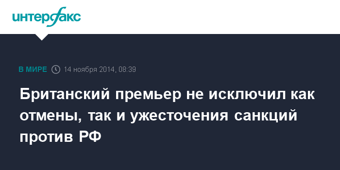 Москва. 14 ноября. INTERFAX.RU - Премьер-министр Великобритании Дэвид Кэмерон в пятницу вновь заявил о возможности ужесточения санкций в отношении России, отметив при этом и вероятность противоположного сценария.