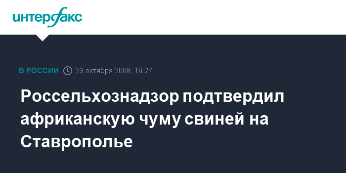 Москва. 23 октября. INTERFAX.RU - Россельхознадзор подтвердил, что причиной массовой гибели свиней в Ставропольском крае стала африканская чума.