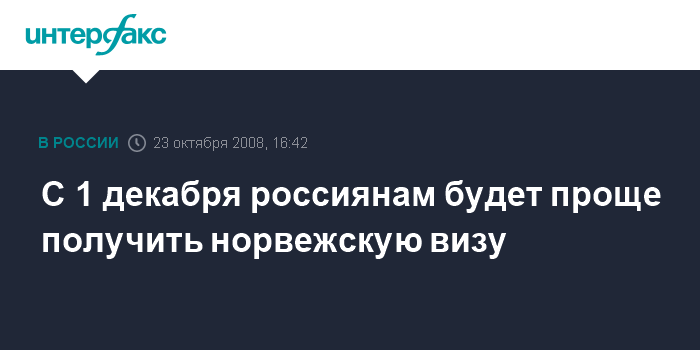 "На днях мы получили ноту от МИД России о том, что договор, который мы подписали (об облегчении визового режима - ИФ), вступит в силу 1 декабря", - сказал он в четверг в эфире радиостанции "Эхо Москвы". По словам норвежского дипломата, это, в частности, означает, что заявки на визу от российских граждан будут обрабатываться проще и быстрее.