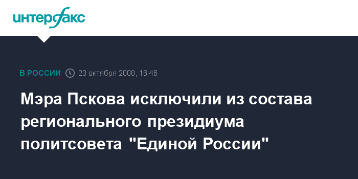 По его словам, решение исключить мэра Пскова из состава президиума приняли в четверг делегаты второго этапа конференции регионального отделения партии в связи с неудовлетворительным выполнением им обязанностей, связанных с налаживаем бесперебойной работы жилищно-коммунального хозяйства города.