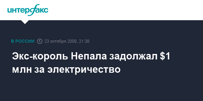 Москва. 23 октября. INTERFAX.RU - Семья бывшего короля Непала Гьянендры должна заплатить более $1 млн за электроэнергию в течение ближайших 15 дней, сообщает в четверг BBC.