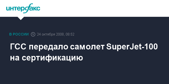 Москва. 24 октября. INTERFAX.RU - ЗАО "Гражданские самолеты Сухого", входящее в холдинг "Сухой", в пятницу передало новый самолет "Суперджет-100" (SSJ-100) в авиационный регистр межгосударственного авиационного комитета (МАК) для сертификации, сообщил на пресс-конференции в Хабаровске глава холдинга "Сухой" Михаил Погосян.