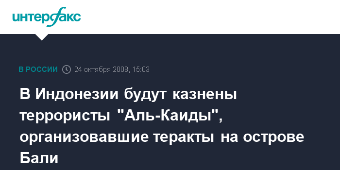Джакарта. 24 октября. INTERFAX.RU - Трое террористов, которые в 2002 г. совершили на острове Бали теракты, унесшие жизни 202 человек, будут расстреляны в начале ноября, сообщает генеральная прокуратура Индонезии.