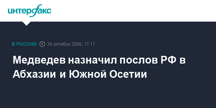 Москва. 24 октября. INTERFAX.RU - Президент РФ Дмитрий Медведев назначил послов России в республиках Южная Осетия и Абхазия.