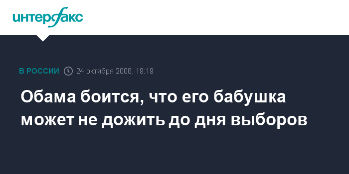Москва. 24 октября. INTERFAX.RU - Кандидат в президенты США от демократов Барак Обама заявил, что его тяжело больная бабушка, возможно, не доживет до дня выборов, сообщает в пятницу американский телеканал ABС.