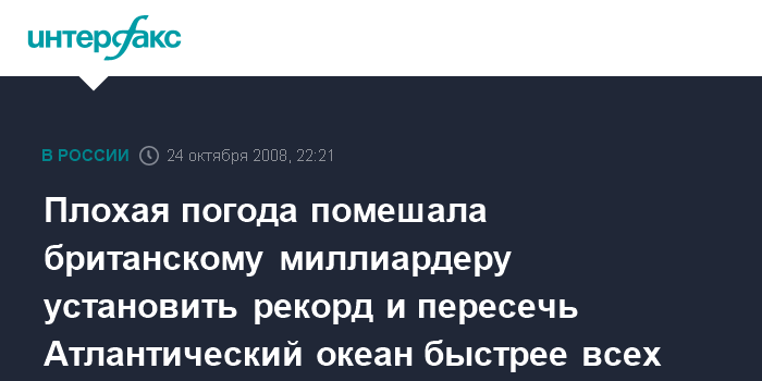 Нью-Йорк. 24 октября. ИНТЕРФАКС - Неблагоприятные погодные условия заставили британского миллиардера Ричарда Брэнсона отказаться от попытки пересечь Атлантический океан на яхте за рекордное время, сообщает в пятницу американский телеканал Си-Эн-Эн.