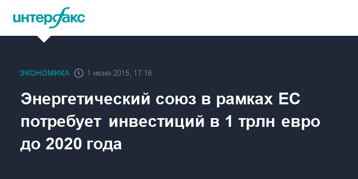 Москва. 1 июня. INTERFAX.RU – Создание единого внутреннего энергорынка в рамках Европейского союза потребует вложений на сумму до 1 трлн евро за период до 2020 года, заявил член Еврокомиссии по энергетике Мигель Ариас Каньете.