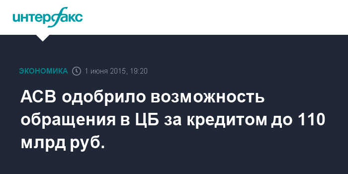 Москва. 1 июня. INTERFAX.RU - Совет директоров Агентства по страхованию вкладов (АСВ) для поддержания финансовой устойчивости фонда страхования вкладов одобрил возможность обращения в Банк России с просьбой о предоставлении кредита (кредитов) общим объемом до 110 млрд рублей на срок до 5 лет, говорится в сообщении АСВ.
