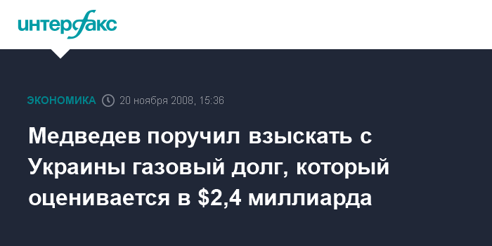 Москва. 20 ноября. INTERFAX.RU - Президент РФ Дмитрий Медведев отдал распоряжение председателю правления "Газпрома" Алексею Миллеру взыскать долг за газ с Украины.