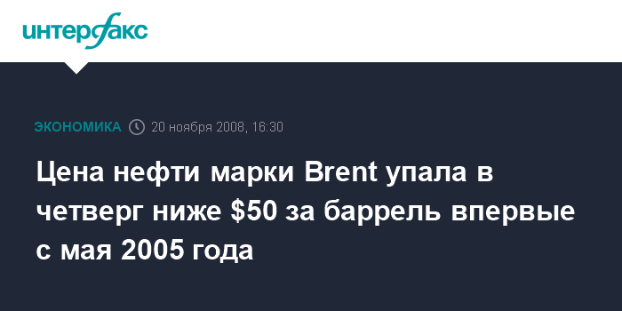 Москва. 20 ноября. INTERFAX.RU - Цена нефти марки Brent упала в четверг ниже $50 за баррель впервые с мая 2005 года, сообщает агентство Bloomberg.