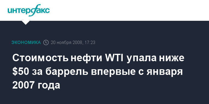 Стоимость нефти WTI упала ниже $50 за баррель впервые с января 2007 года