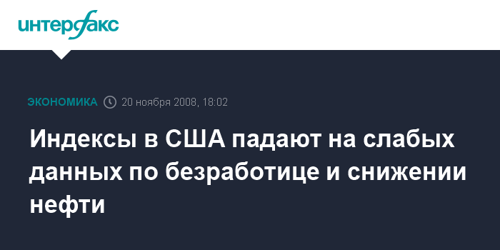 Москва. 20 ноября. INTERFAX.RU - Американские фондовые индексы снижаются в ходе торгов в четверг на данных об увеличении числа заявок на пособие по безработице на прошлой неделе до максимального уровня с 1992 года, сообщило агентство Bloomberg. Негативное влияние на рынок оказывает также падение стоимости нефти ниже $50 за баррель, способствующее снижению цен акций нефтяных компаний. Число американцев, впервые обратившихся за пособием по безработице, на прошлой неделе увеличилось на 27 тыс. - до 542 тыс., максимума с 1992 года. Аналитики ожидали снижения этого показателя на 11 тыс. Количество людей, продолжающих получать пособие по безработице, за неделю, завершившуюся 9 ноября, увеличилось до 4,012 млн - максимального уровня с декабря 1982 года.