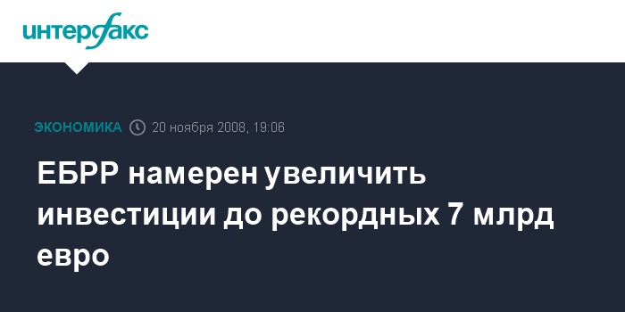 Москва. 20 ноября. INTERFAX.RU - Европейский банк реконструкции и развития (ЕБРР) намерен увеличить инвестиции в 2009 г. на 20% по сравнению с первоначальным планом - до 7 млрд евро. Это максимальный показатель за всю историю существования ЕБРР, говорится в сообщении банка.