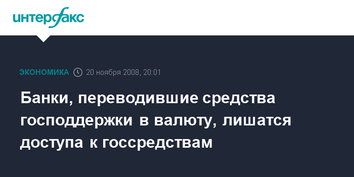 Москва. 20 ноября. INTERFAX.RU - Банки, переводившие средства господдержки в валюту, лишатся доступа к госсредствам, заявил первый вице-премьер РФ Игорь Шувалов журналистам в четверг.
