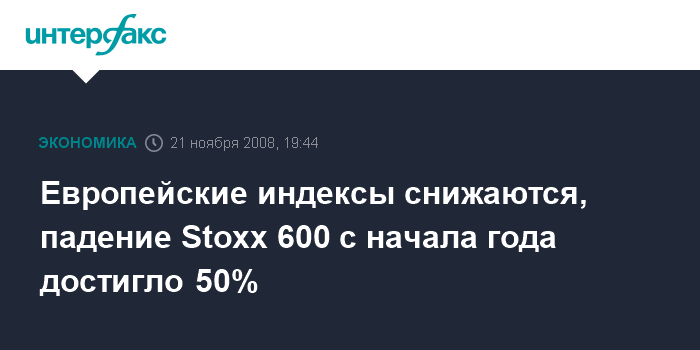 Москва. 21 ноября. INTERFAX.RU - Европейские фондовые индексы падают в пятницу на фоне негативных прогнозов Goldman Sachs для американской экономики, а также на растущих опасениях относительно ситуации в Citigroup, сообщило агентство Bloomberg. Dow Jones Stoxx 600 упал в ходе торгов на 3,7%, за неделю индекс рухнул на 13%, с начала 2008 года - на 50%.