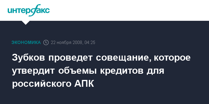 Москва. 22 ноября. ИНТЕРФАКС - Первый вице-премьер Виктор Зубков проведет в субботу совещание с банками - крупнейшими кредиторами сельского хозяйства, где будут утверждены согласованные объемы кредитования АПК.