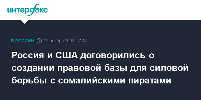 Как сообщил журналистам помощник президент РФ Сергей Приходько, "оба президента договорились о необходимости начала работы в Совете безопасности ООН по созданию правовой базы для применения совместных силовых мер против сомалийских пиратов".