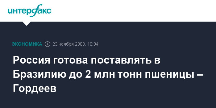 Москва. 23 ноября. INTERFAX.RU - Россия готова поставлять в Бразилию порядка 2 млн тонн пшеницы и увеличить импорт бразильской сои до 1 млн тонн.